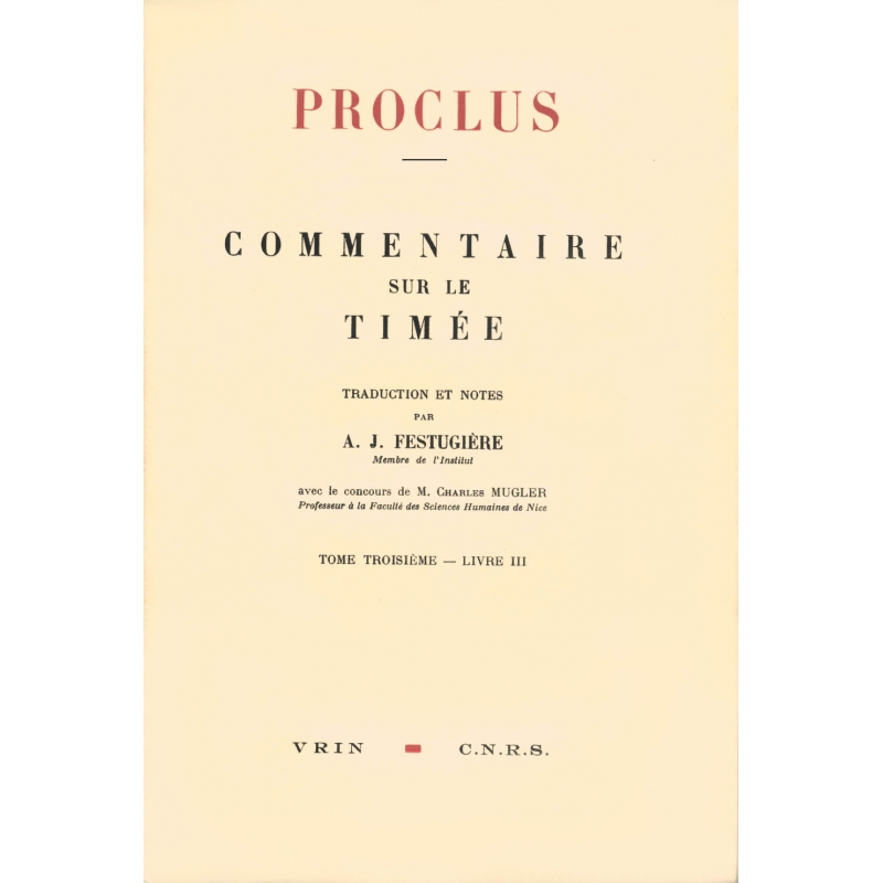 • Malheureusement nous n'avons conservé de ce volumineux travail que le premier tiers, soit cinq livres qui couvrent l'Introduction (Tim. 17a-27b, résumé de la République et mythe de l'Atlantide) et la première partie (Tim. 27c-47e, qui concerne le Monde en tant que création de l'Intellect, et les dix dons qu'il fait au Monde). Mais nous savons que Proclus avait commenté le dialogue entier puisqu'une partie de la fin (Tim. 89e-90c) a été retrouvée en arabe dans la traduction d'Hunain Ibn Ishaq.