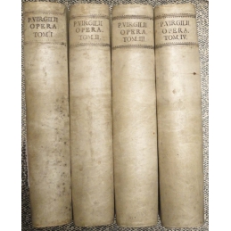 ►Virgile En latin, Amsterdam, sumptibus Jacobi Wetstenii, 1746. 21 x 26, [66], 82, 519, [1] - [4], 706 - [4], 707 - [4], 358, [2], [376] pages. Quatre tomes reliés plein vélin en bon état, manque de vélin (3 cm) sur la tranche du coin bas recto (tome III). Dos lisse avec titre en écriture manuscrite à l'encre noire. Tranche jaspée points rouges....