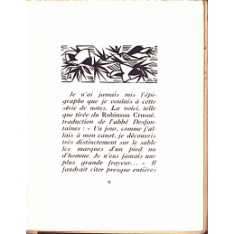 Je n'ai jamais mis l'épigraphe que je voulais à cette série de notes. La voici, telle que tirée du Robinson Crusoé, traduction de l'abbé Desfontaines : « Un jour, comme j'allais à mon canot, je découvris très distinctement sur le sable les marques d'un pied nu d'homme. Je n'eus jamais une plus grande frayeur… » Il faudrait citer presque entières deux ou trois pages. C'est bien l'impression que l'on éprouve à deviner autour de soi le mouvement invisible des hommes. Dès qu'on a vu des pas sur le sable, il faut rentrer chez soi et s'y enfermer.